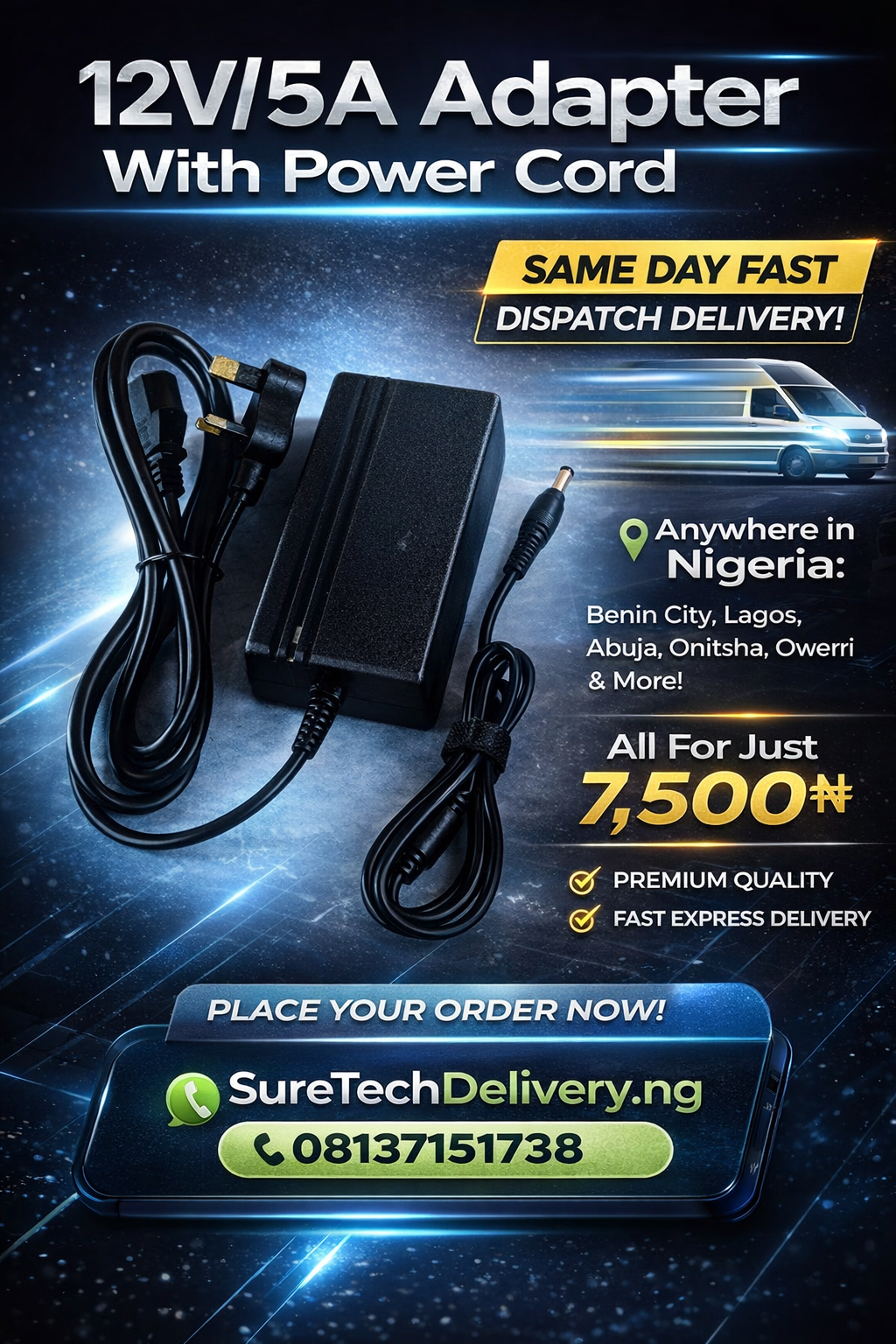 Looking for a reliable, original and premium quality 12V/5A Adapter With Power Cord in Nigeria? At SureTechDeliveryNG, we supply high-performance 12 Volt 5 Amp power adapters for just ₦7,500, with fast express delivery nationwide — including Benin City, Lagos, Abuja, Delta State, Onitsha, Asaba, Warri, Port Harcourt, Ibadan, Enugu, Kano, Kaduna, Uyo, Calabar, Ekpoma and many more locations across Nigeria.