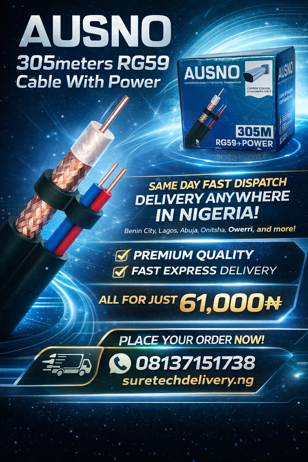 SureTechDeliveryNG offers the Ausno 305meters RG59 Cable With Power at an affordable price of ₦61,000, available for immediate nationwide delivery.