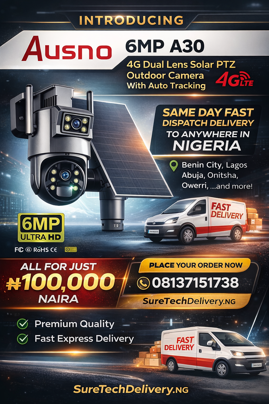 You can order the Ausno 6MP A30 4G Dual Lens Solar PTZ Outdoor Camera With Auto Tracking (UBOX APP) today from Suretechdeliveryng.