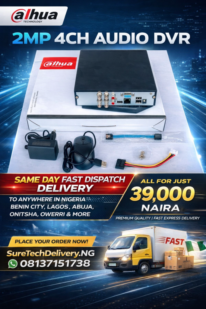 Upgrade your security system today with the powerful and reliable Dahua 2MP 4CH Audio DVR, available for ₦39,000 with fast express delivery anywhere in Nigeria. At Suretech Delivery NG, we supply 100% premium quality CCTV equipment designed for homes, offices, shops, warehouses, hotels, schools, and business environments.