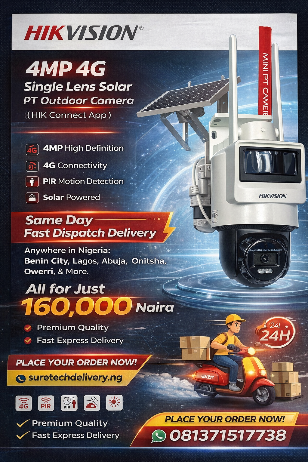 Hikvision solar camera Nigeria, Hikvision 4MP 4G camera price in Nigeria, solar CCTV camera with SIM card, outdoor solar security camera Nigeria, 4G security camera without WiFi, solar powered CCTV camera price Nigeria, Hikvision PT camera Nigeria, buy Hikvision camera in Lagos, solar security camera Benin City, 4G LTE CCTV camera Nigeria, best solar camera for farm Nigeria, security camera for construction site Nigeria, Hikvision HIK Connect camera Nigeria, solar camera with night vision Nigeria, motion detection CCTV Nigeria, wireless outdoor security camera Nigeria, Hikvision camera dealer Nigeria, 4MP solar PT camera price, SIM card CCTV camera Nigeria, outdoor surveillance camera with solar panel Nigeria