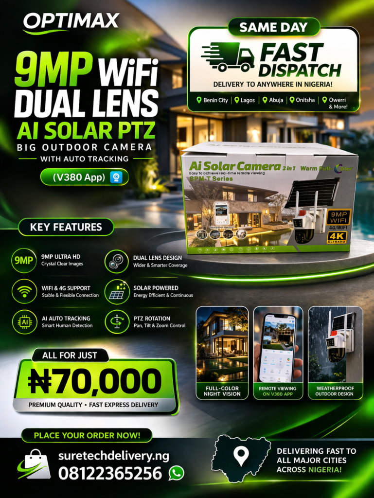 Upgrade your home or business security today with the OPTIMAX 9MP WiFi Dual Lens AI Solar PTZ Big Outdoor Camera with Auto Tracking, a powerful AI smart security camera designed for modern surveillance in Nigeria. At SureTechDeliveryNG, we provide premium quality security cameras with fast delivery to every part of Nigeria including Lagos, Abuja, Benin City, Delta State, Onitsha, Asaba, Warri, Port Harcourt, Ibadan, Kano, Enugu, Uyo, Calabar and many more locations.