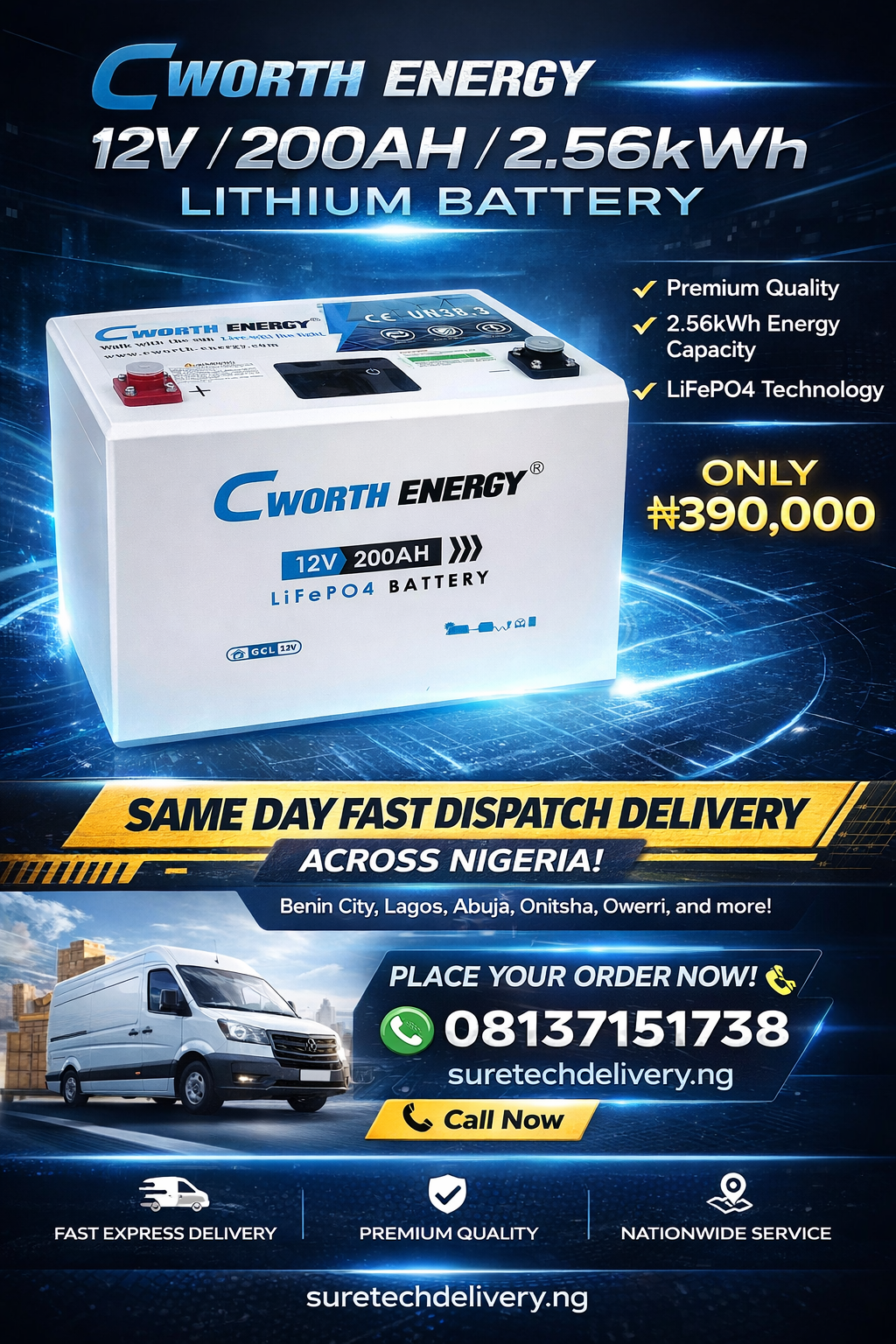 At Suretechdeliveryng, we supply 100% original premium-quality lithium batteries with fast express delivery to anywhere in Nigeria, including Benin City, Lagos, Abuja, Delta State, Onitsha, Asaba, Warri, Ibadan, Port Harcourt, Enugu, and many more locations nationwide.
