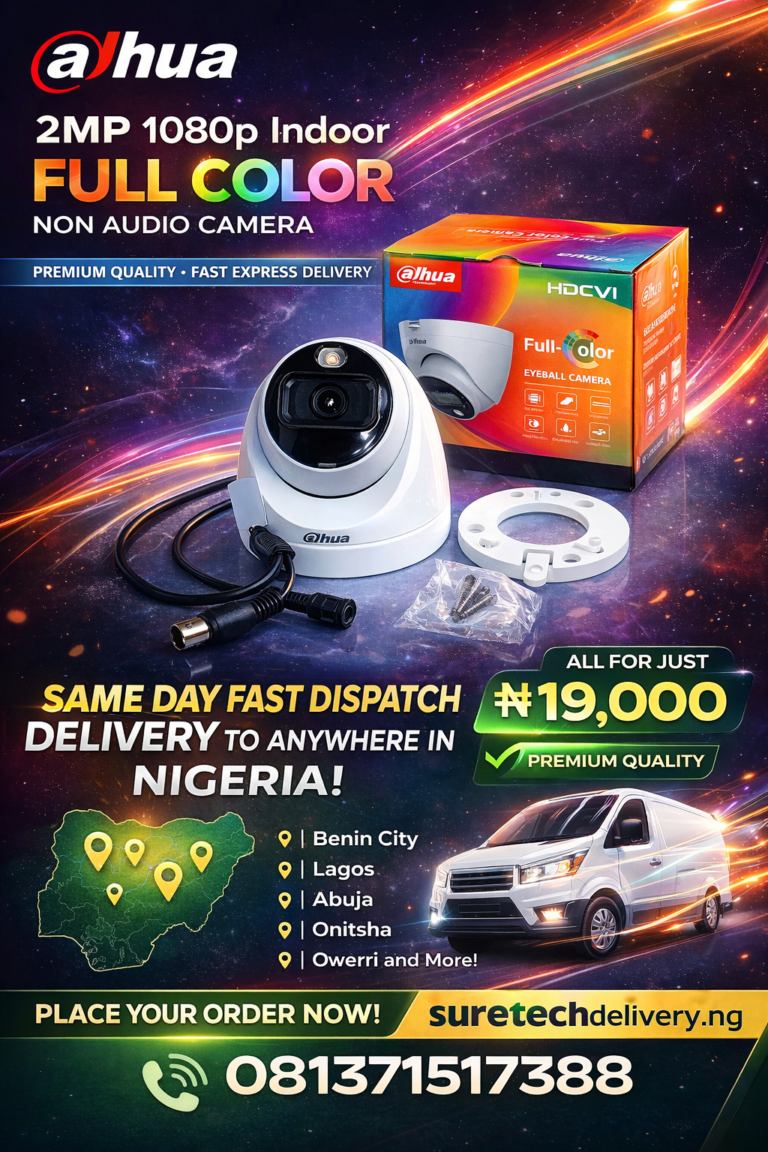 Dahua 2MP 1080p Indoor FULL COLOR Non-Audio Camera – Premium Quality CCTV Camera (₦19,000) Premium Quality Security Camera with Fast Express Delivery Across Nigeria! Upgrade your home or business security today with the powerful Dahua 2MP 1080p Indoor Full Color…