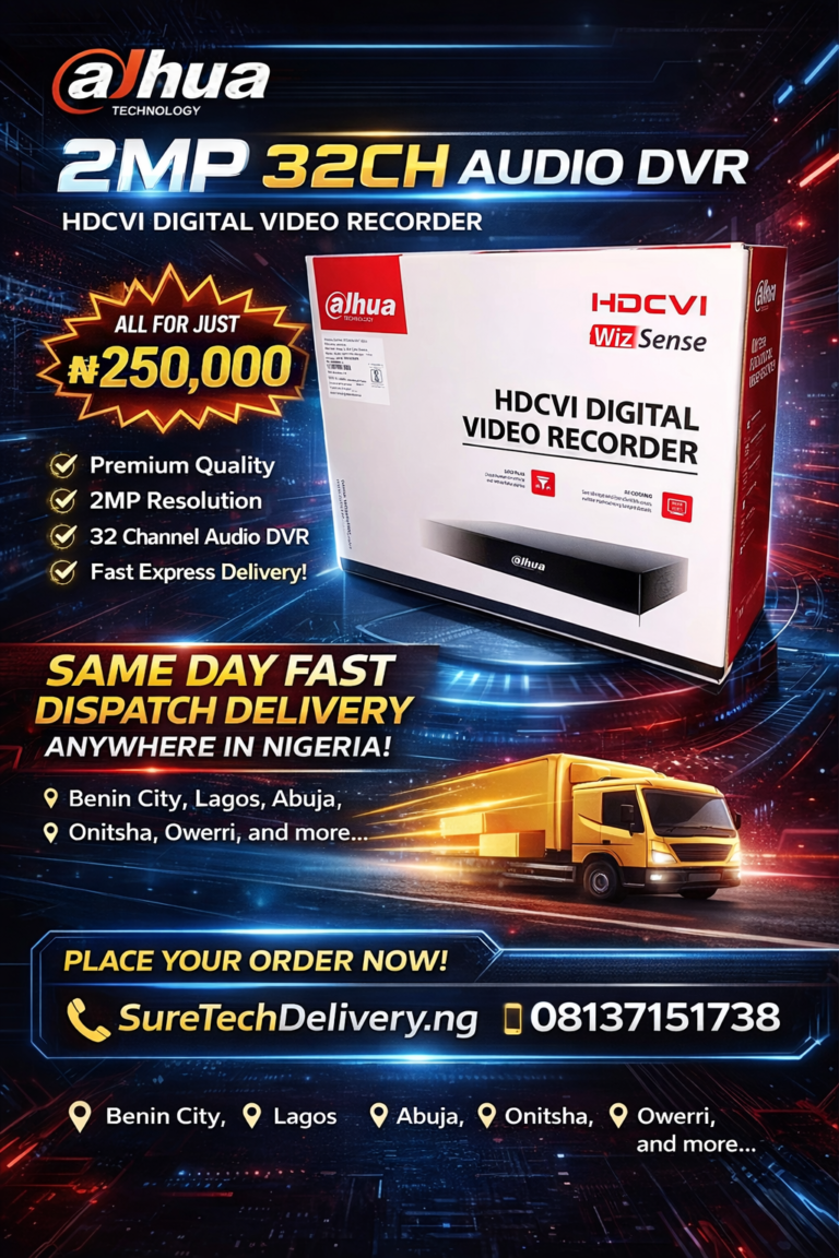 Dahua 5MP 32CH Audio DVR – Premium Quality CCTV Recorder | Fast Express Delivery Anywhere in Nigeria – ₦360,000 PREMIUM QUALITY SECURITY EQUIPMENT WITH FAST EXPRESS DELIVERY ANYWHERE IN NIGERIA. At SureTechDeliveryNG, we supply 100% original premium security products with…