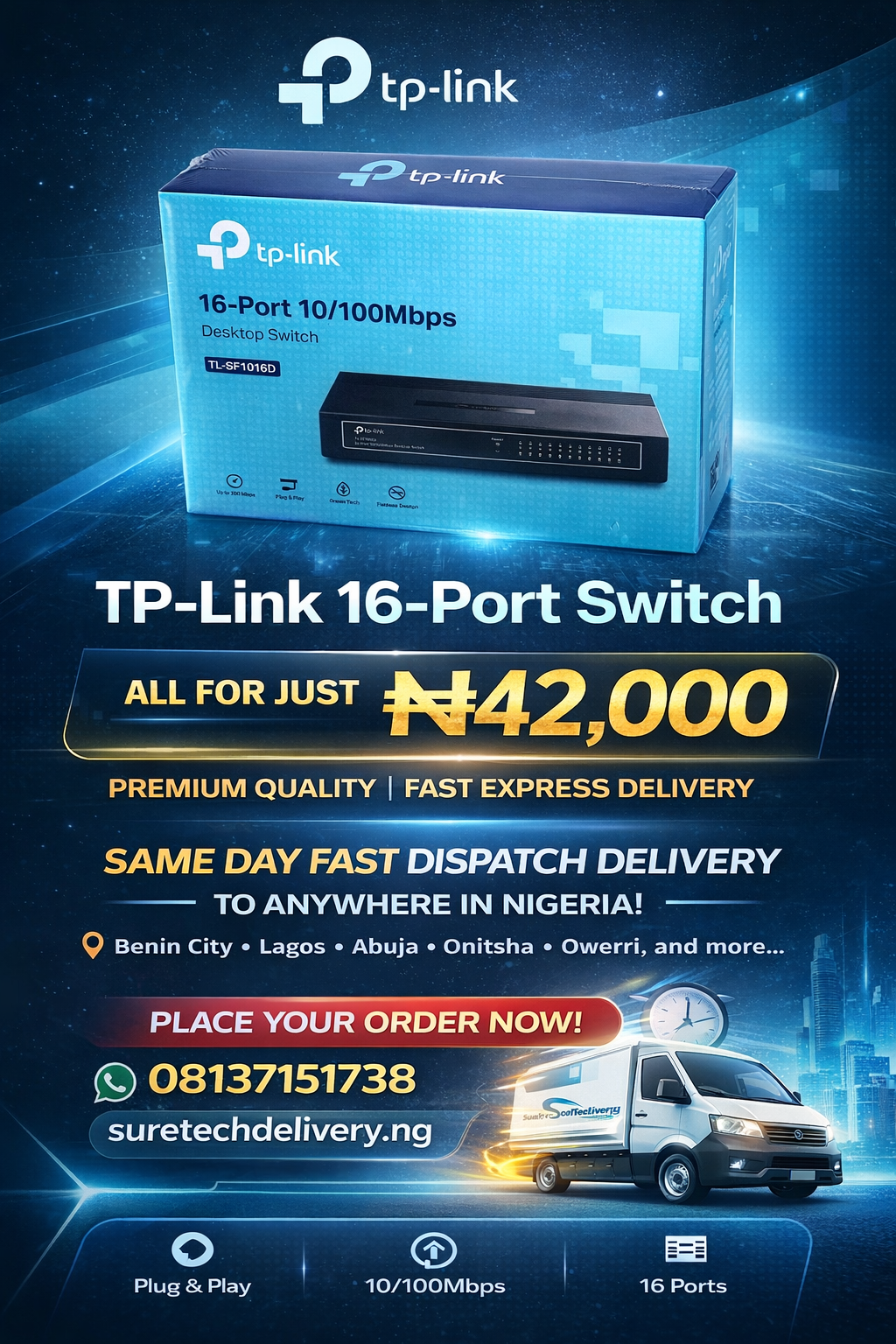 At SureTechDeliveryNG, we provide premium quality networking equipment designed for businesses, offices, cyber cafés, CCTV installations, schools, hotels, and homes. We deliver quickly to major cities including **Benin City, Lagos, Abuja, Onitsha, Asaba, Warri, and every other location across Nigeria.