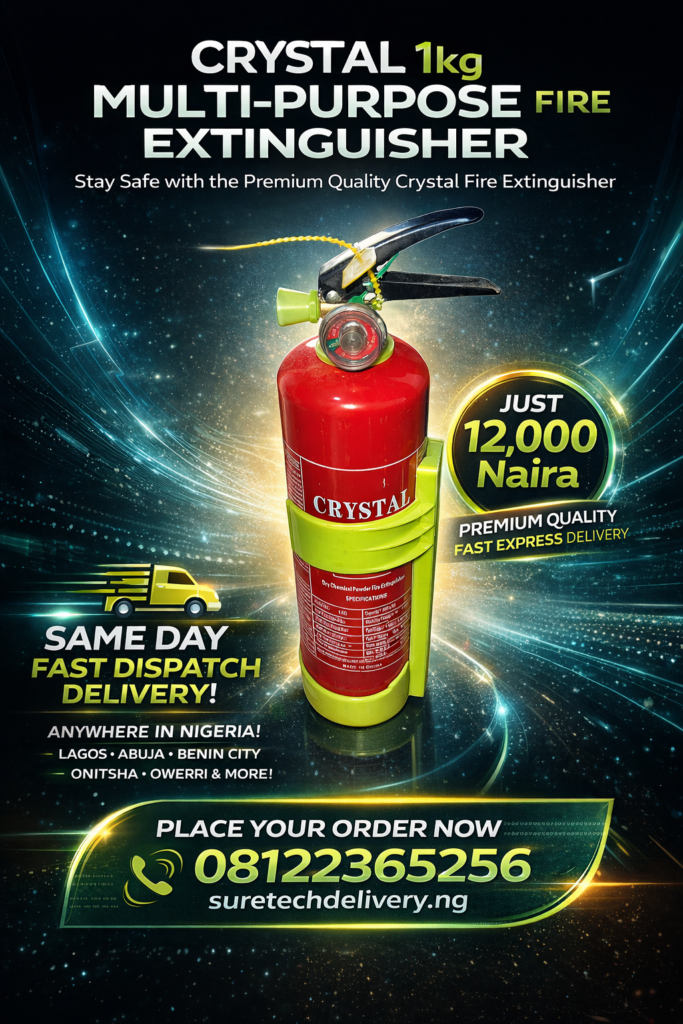 Protect your home, office, shop, warehouse, vehicle, and business premises with the CRYSTAL 1kg Multi-Purpose Fire Extinguisher, a reliable and highly effective fire protection solution designed for quick emergency response. At Suretechdeliveryng, we provide premium quality fire safety equipment with fast express delivery anywhere in Nigeria, including Benin City, Lagos, Abuja, Delta State, Onitsha, Asaba, Warri, Port Harcourt, Ibadan, Enugu, Kano, and many other locations.