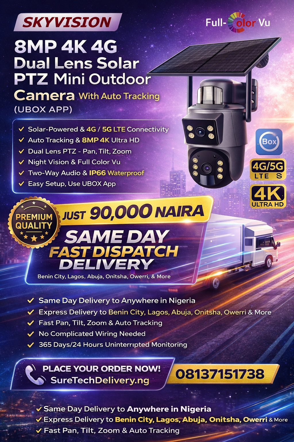 Protect your home, office, shop, warehouse, farm, or business premises with the powerful SKYVISION 8MP 4K 4G Dual Lens Solar PTZ Mini Outdoor Camera with Auto Tracking (UBOX APP). This premium-quality solar powered security camera delivers crystal-clear 8MP 4K ultra HD surveillance, smart auto human tracking, and reliable 4G SIM connectivity, making it one of the most advanced outdoor security cameras available in Nigeria today.