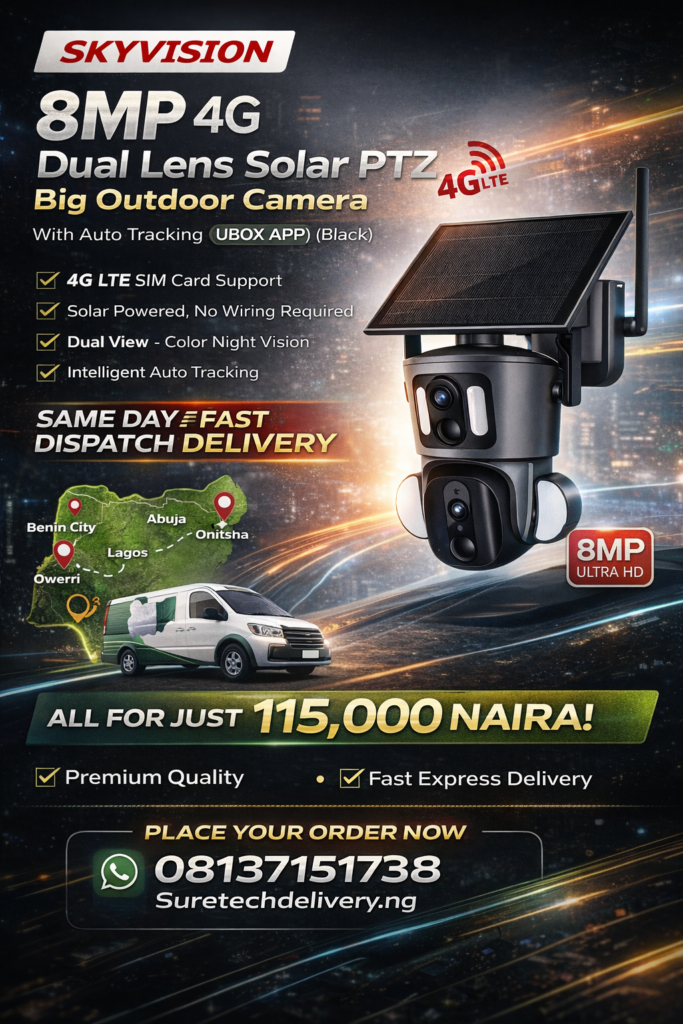 The SKYVISION 8MP 4G Dual Lens Solar PTZ Big Outdoor Camera With Auto Tracking (UBOX APP) is a high-performance smart solar CCTV security camera designed for Nigerian homes, offices, shops, warehouses, farms, construction sites, and estates.