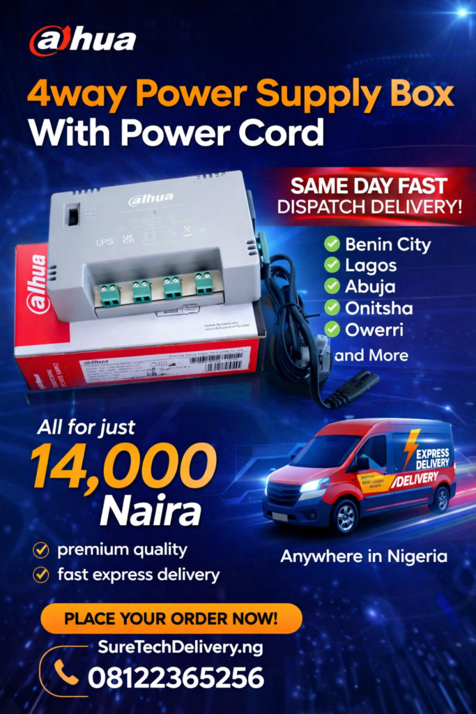 Power your CCTV system safely and efficiently with the reliable Dahua 4 Way Power Supply Box With Power Cord, available for just ₦14,000. At Suretech Delivery NG, we specialize in premium quality CCTV accessories with fast express delivery anywhere in Nigeria.